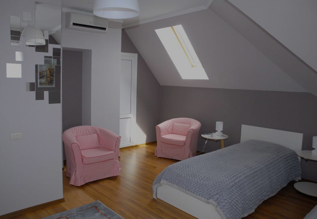 Трехэтажный особняк, на втором этаже размещается три комнаты с одной двуспальной кроватью; на третьем этаже – две комнаты с двумя односпальными кроватями.